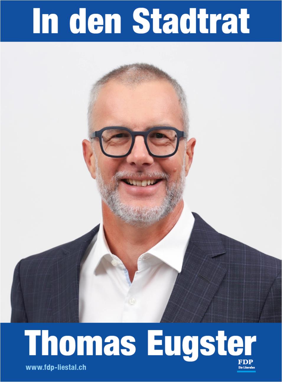 Thomas Eugster (55) ist verheiratet und Vater von zwei erwachsenen Kindern. 2010 wurde Eugster Liestaler Einwohnerrat und war von 2012 bis 2020 Mitglied der Bau- und Planungskommission, ab 2016 als deren Präsident. Seit 2015 ist er Landrat und Mitglied der Bau- und Planungskommission, ab 2023 als deren Präsident. Weiter war er vier Jahre Mitglied der landrätlichen Geschäftsprüfungskommission und ist aktuell auch Mitglied der landrätlichen Bildungs-, Sport- und Kulturkommission. Er ist zudem Mitglied des Verwaltungsrats der Sport- und Volksbad Gitterli AG und Vizepräsident des HEV Liestal. Sein Studium als Verfahrensingenieur schloss er 1996 an der ETH Zürich ab. Seit 1996 arbeitet er für die Firma Hoffmann-La Roche in verschiedenen Funktionen, u.a. als Leiter des Engineerings der Wirkstoffproduktion, aber auch als Projektleiter, u.a. auch für Großprojekte, als Projektingenieur und Coach. Er lebt mit seiner Familie seit 1998 in Liestal, ist dort fest verwurzelt und nimmt unter anderem auch als Chienbäseträger aktiv am Liestaler Brauchtum teil.